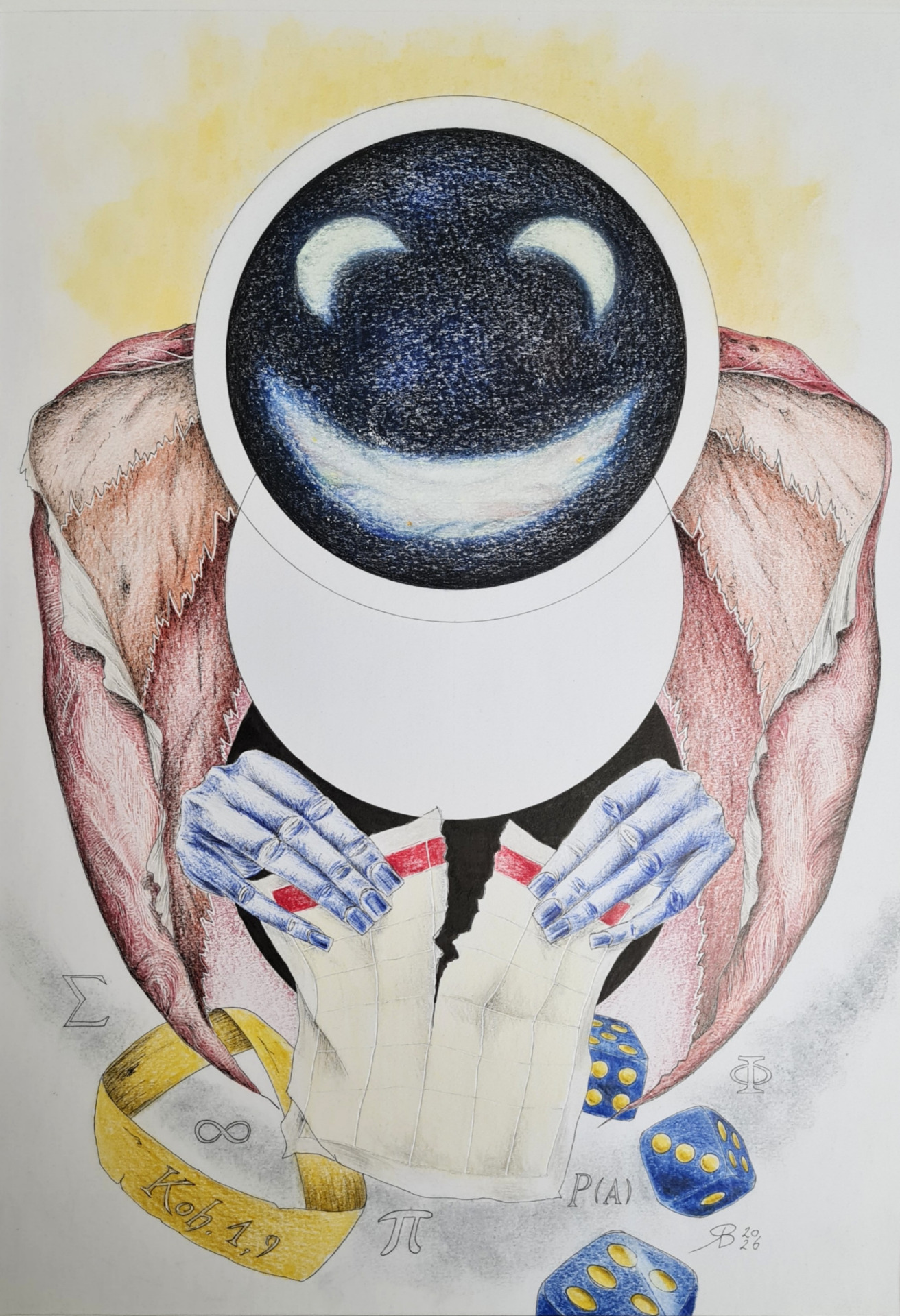 >Der lachende Gott< - 2026, Farbstift, Tusche, Lumineszierende Tusche
